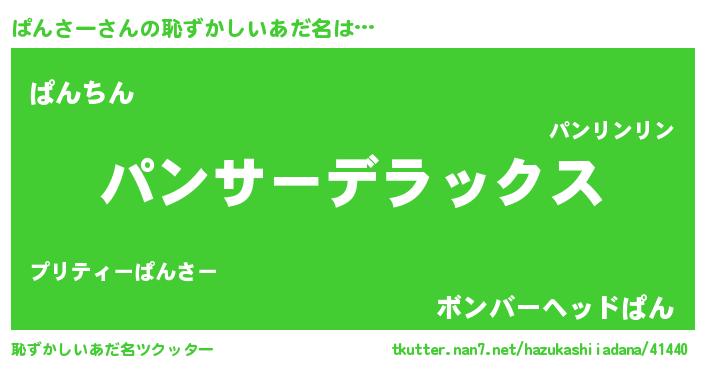 | 男性向けラノベタイトル風あだ名 | 『Re:ぱんさーから始める異世界生活』 |