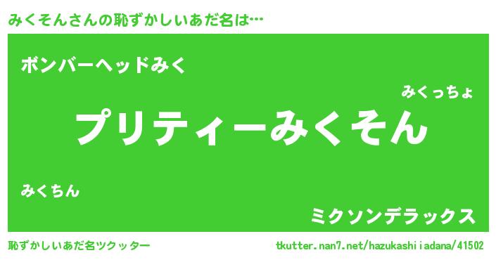 | 意味不明あだ名 | 『住所不定無職みくそん(93歳)』 |