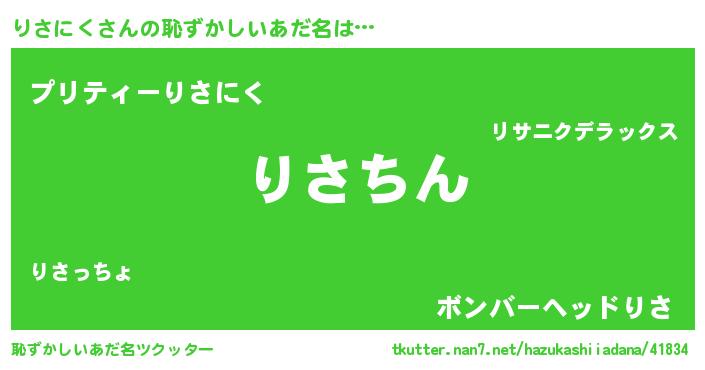 りさにくさんの恥ずかしいあだ名は… 『りさちん』『プリティーりさにく』『ボンバーヘッドりさ』 ツクッター #恥ずかしいあだ名ツクッター http://tkutter.nan7.net/hazukashiiadana/41834/