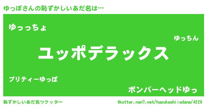 | 男性向けラノベタイトル風あだ名 | 『この素晴らしい世界にゆっぽを!』 |