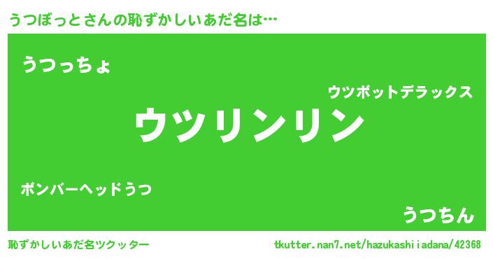 | 男性向けラノベタイトル風あだ名 | 『うつぼっと~年齢イコール彼女いない歴の魔法使い~』 |