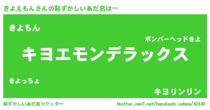 | 男性向けラノベタイトル風あだ名 | 『Re:きよえもんから始める異世界生活』 |