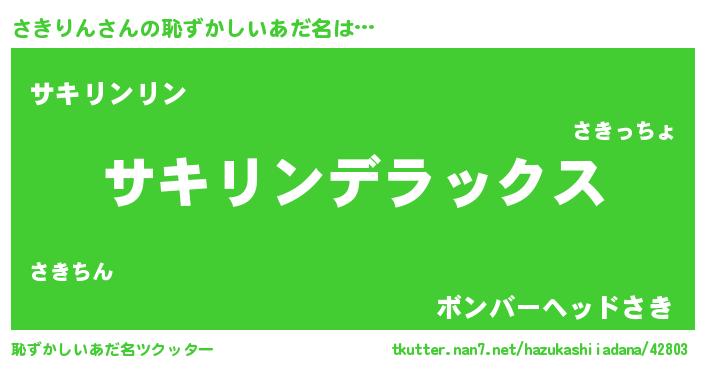 | 男性向けラノベタイトル風あだ名 | 『サキリンスレイヤー』 |