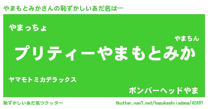 | 男性向けラノベタイトル風あだ名 | 『やまもとみか~年齢イコール彼女いない歴の魔法使い~』 |