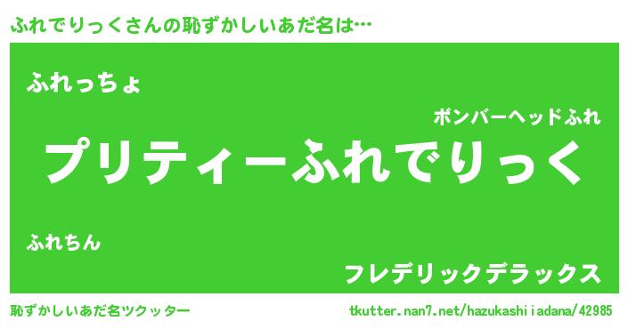 | 男性向けラノベタイトル風あだ名 | 『ふれでりっく~年齢イコール彼女いない歴の魔法使い~』 |