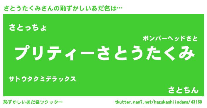 | ヒーロー風カッコイイあだ名 | 『スーパーサトウタクミ』『仮面サトダー』 |