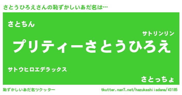 さとうひろえさんの恥ずかしいあだ名は… 『プリティーさとうひろえ』『さとちん』『さとっちょ』 ツクッター #恥ずかしいあだ名ツクッター http://tkutter.nan7.net/hazukashiiadana/43185/