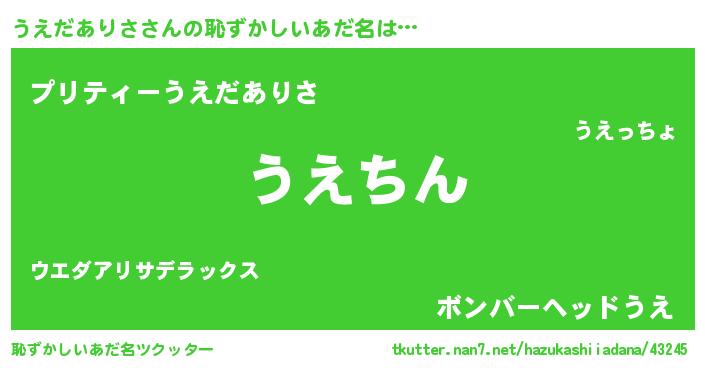 | ヘコむあだ名 | 『うえだありさ(遠い目)』『うえにゅー』 |