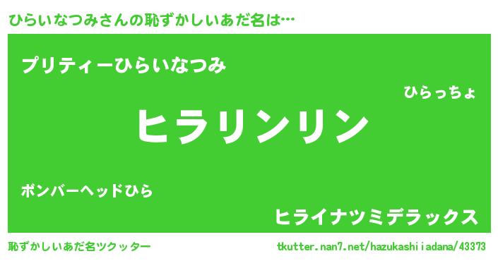 | 男性向けラノベタイトル風あだ名 | 『ひらいなつみ~年齢イコール彼女いない歴の魔法使い~』 |