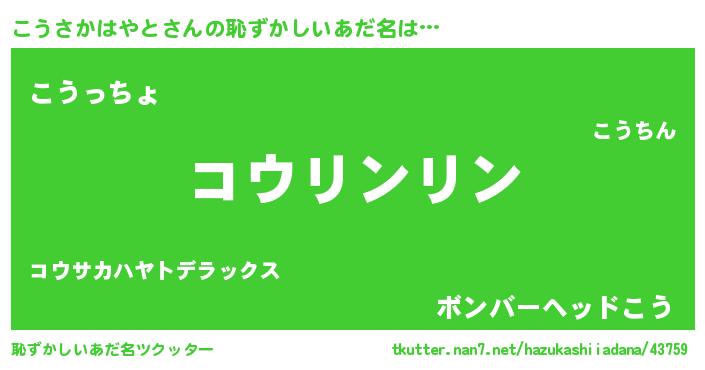 | 男性向けラノベタイトル風あだ名 | 『こうさかはやとに滅ぼされるだけの簡単なお仕事です』 |