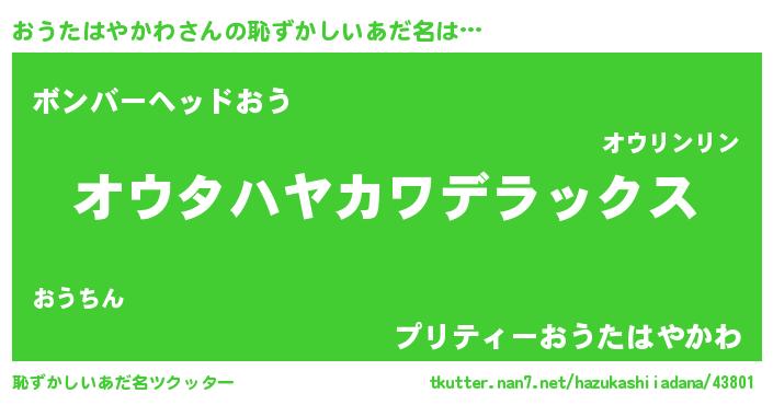 | 男性向けラノベタイトル風あだ名 | 『この素晴らしい世界におうたはやかわを!』 |