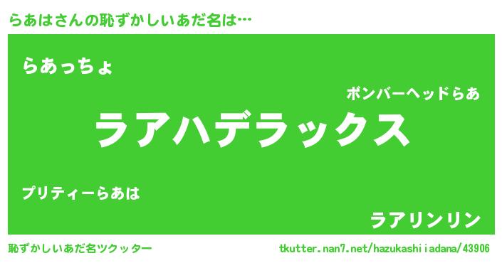 | 男性向けラノベタイトル風あだ名 | 『この素晴らしい世界にらあはを!』 |