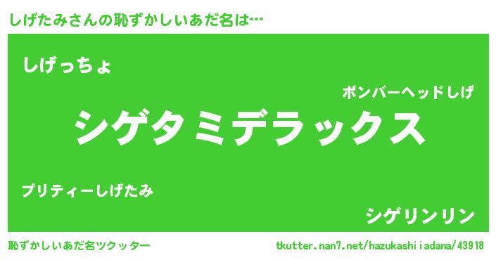 | 男性向けラノベタイトル風あだ名 | 『Re:しげたみから始める異世界生活』 |