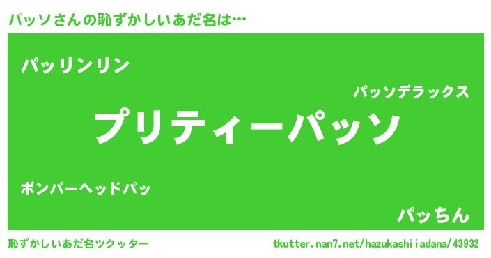 | 男性向けラノベタイトル風あだ名 | 『パッソ~年齢イコール彼女いない歴の魔法使い~』 |