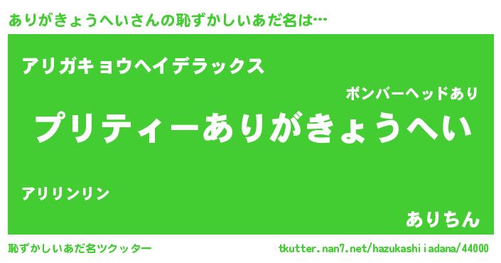 | 男性向けラノベタイトル風あだ名 | 『ありがきょうへいの憂鬱』 |