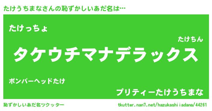 | 男性向けラノベタイトル風あだ名 | 『Re:たけうちまなから始める異世界生活』 |