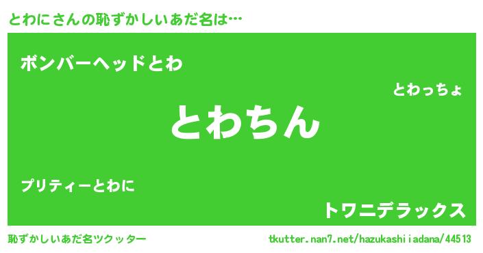 | ヒーロー風カッコイイあだ名 | 『ネオトワニ』『正義の使者とわに』 |