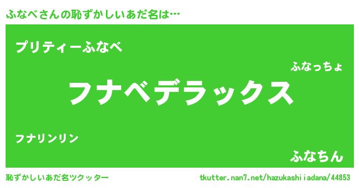 | 男性向けラノベタイトル風あだ名 | 『ふなべ~年齢イコール彼女いない歴の魔法使い~』 |
