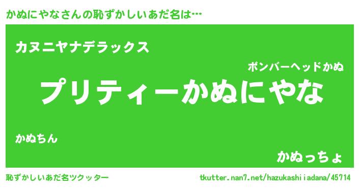 かぬにやなさんの恥ずかしいあだ名は… 『プリティーかぬにやな』『カヌニヤナデラックス』『かぬっちょ』 ツクッター #恥ずかしいあだ名ツクッター http://tkutter.nan7.net/hazukashiiadana/45714/