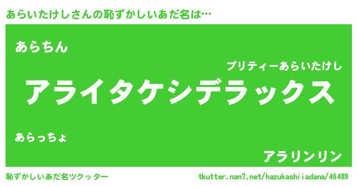 | ヒーロー風カッコイイあだ名 | 『仮面アラダー』『究極戦士アライタケシ』 |