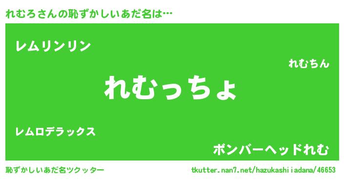 れむろさんの恥ずかしいあだ名は… 『れむっちょ』『レムリンリン』『ボンバーヘッドれむ』 ツクッター #恥ずかしいあだ名ツクッター http://tkutter.nan7.net/hazukashiiadana/46653/
