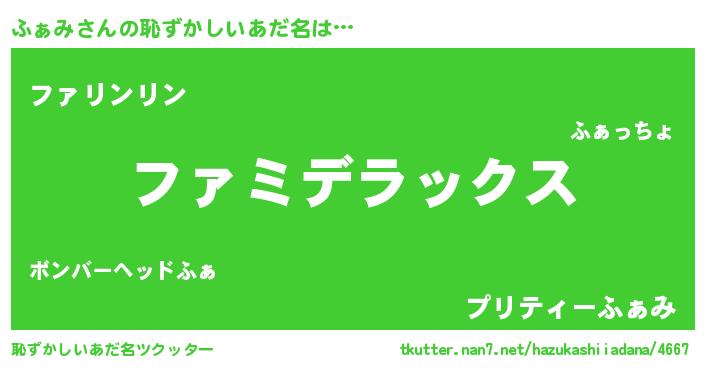 | 女子向けラノベタイトル風あだ名 | 『ふぁみなんてお断りですっ。』 |