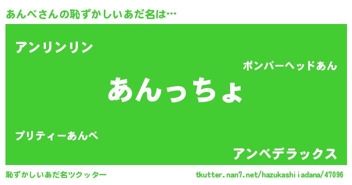| 男性向けラノベタイトル風あだ名 | 『この素晴らしい世界にあんべを!』 |
