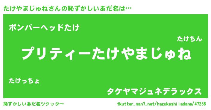| ヘコむあだ名 | 『たけにー』『たけやまじゅね(震え声)』 |