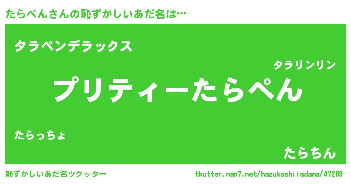 | 男性向けラノベタイトル風あだ名 | 『たらぺんの憂鬱』 |