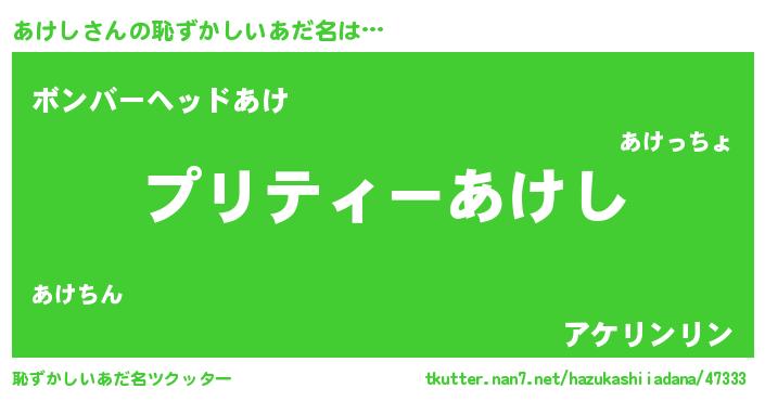 | 男性向けラノベタイトル風あだ名 | 『あけしの憂鬱』『はたらくあけしさま!』 |