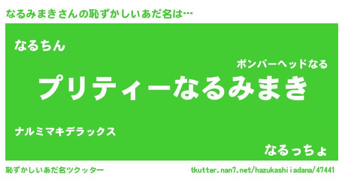 なるみまきさんの恥ずかしいあだ名は… 『プリティーなるみまき』『なるちん』『なるっちょ』 ツクッター #恥ずかしいあだ名ツクッター http://tkutter.nan7.net/hazukashiiadana/47441/