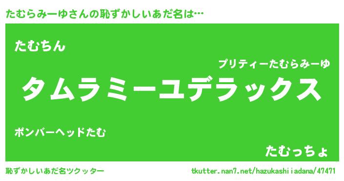 たむらみーゆさんの恥ずかしいあだ名は… 『タムラミーユデラックス』『たむちん』『たむっちょ』 ツクッター #恥ずかしいあだ名ツクッター http://tkutter.nan7.net/hazukashiiadana/47471/