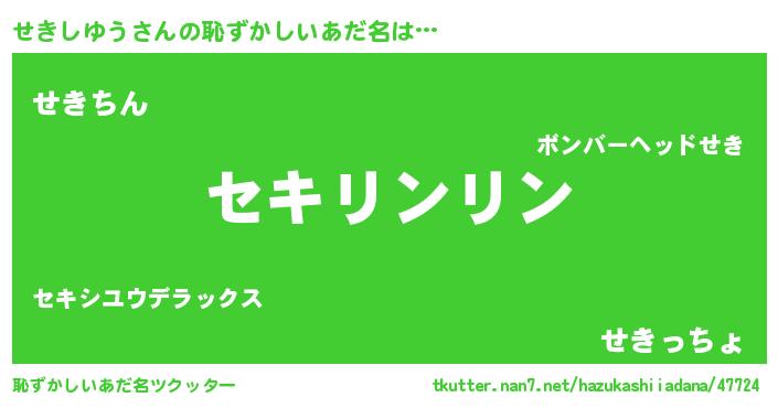 | 男性向けラノベタイトル風あだ名 | 『せきしゆう~年齢イコール彼女いない歴の魔法使い~』 |