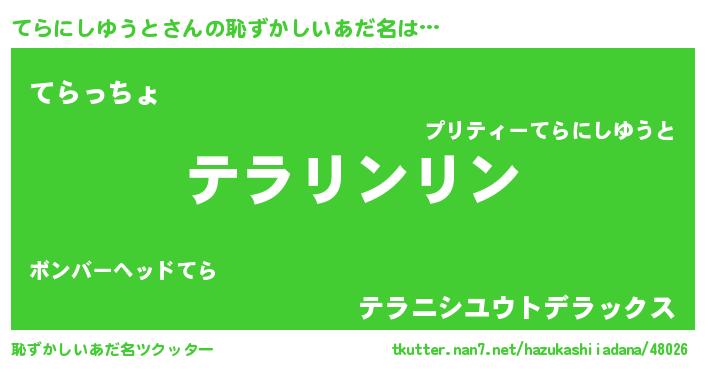 | 男性向けラノベタイトル風あだ名 | 『てらにしゆうとの嫁は女の子じゃないと思った?』 |
