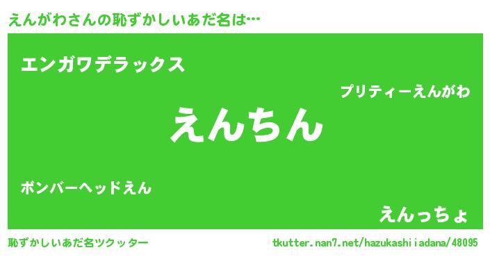 | 男性向けラノベタイトル風あだ名 | 『えんがわ~年齢イコール彼女いない歴の魔法使い~』 |