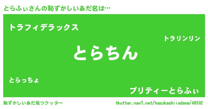 | ヘコむあだ名 | 『とらふぃ(遠い目)』『とらふぇ~』 |