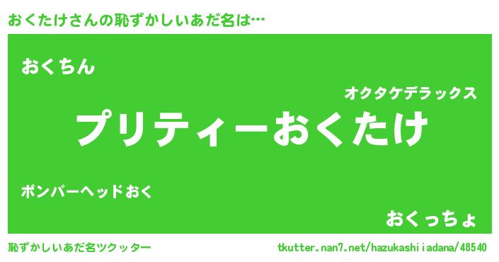 | 男性向けラノベタイトル風あだ名 | 『魔弾の王とおくたけ』『おくたけの憂鬱』 |
