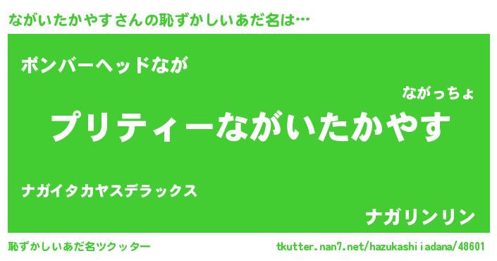 | 男性向けラノベタイトル風あだ名 | 『転生したらながいたかやすだった件』 |