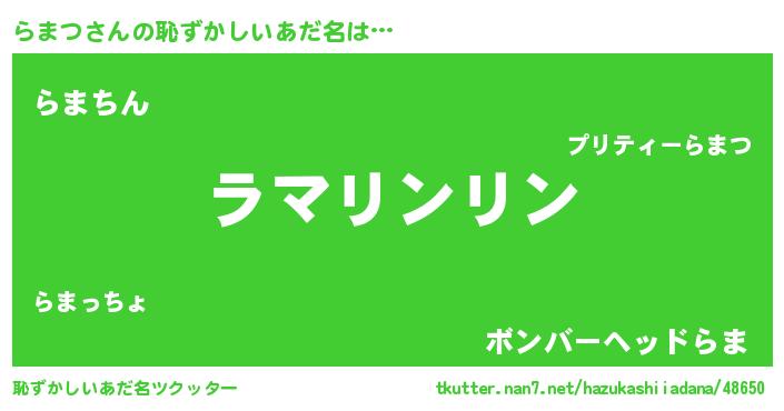 らまつさんの恥ずかしいあだ名は… 『ラマリンリン』『らまちん』『ボンバーヘッドらま』 ツクッター #恥ずかしいあだ名ツクッター http://tkutter.nan7.net/hazukashiiadana/48650/