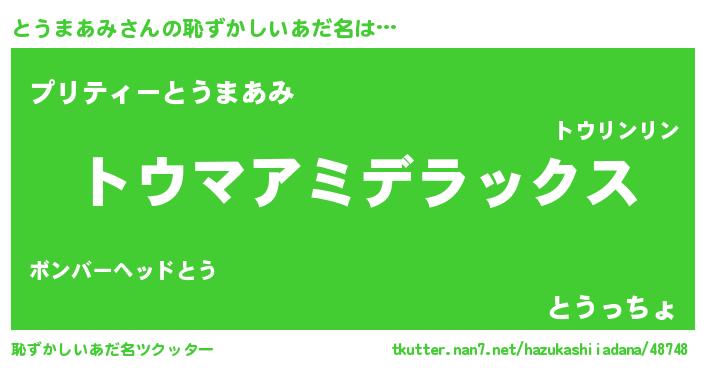 | 男性向けラノベタイトル風あだ名 | 『とうまあみ~年齢イコール彼女いない歴の魔法使い~』 |