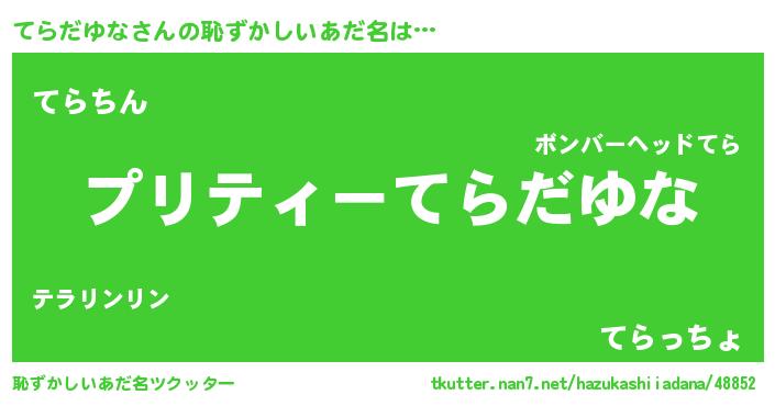 てらだゆなさんの恥ずかしいあだ名は… 『プリティーてらだゆな』『てらちん』『てらっちょ』 ツクッター #恥ずかしいあだ名ツクッター http://tkutter.nan7.net/hazukashiiadana/48852/