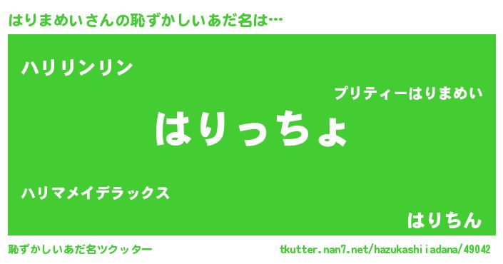 | 男性向けラノベタイトル風あだ名 | 『転生したらはりまめいだった件』 |