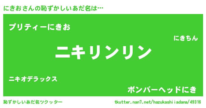 | 男性向けラノベタイトル風あだ名 | 『魔弾の王とにきお』『にきおの憂鬱』 |
