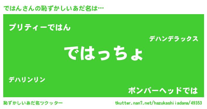 ではんさんの恥ずかしいあだ名は… 『ではっちょ』『プリティーではん』『ボンバーヘッドでは』 ツクッター #恥ずかしいあだ名ツクッター http://tkutter.nan7.net/hazukashiiadana/49353/