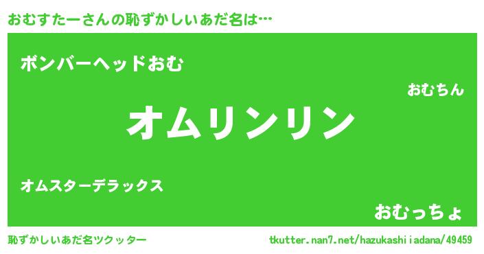 | 男性向けラノベタイトル風あだ名 | 『転生したらおむすたーだった件』 |