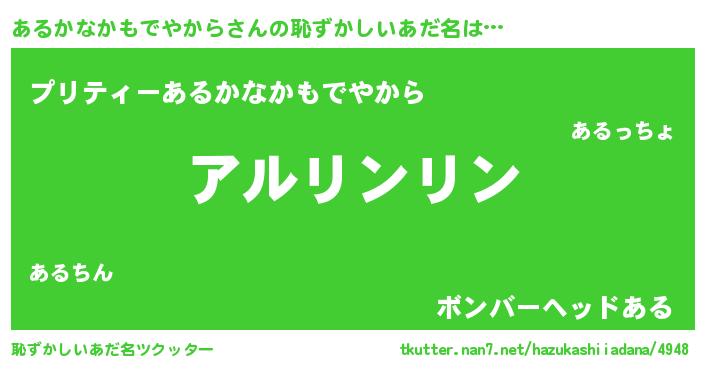 | 意味不明あだ名 | 『住所不定無職あるかなかもでやから(89歳)』 |