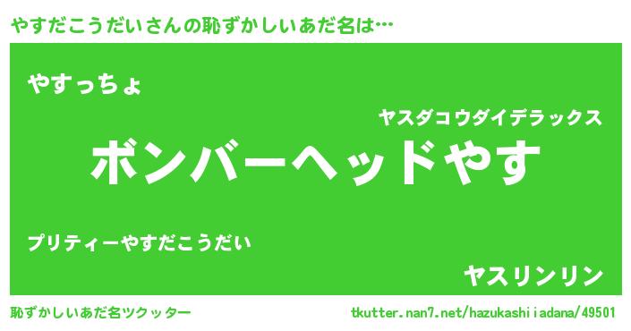 | 男性向けラノベタイトル風あだ名 | 『おまえをオタクにしてやるから、俺をやすだこうだいにしてくれ! 』 |