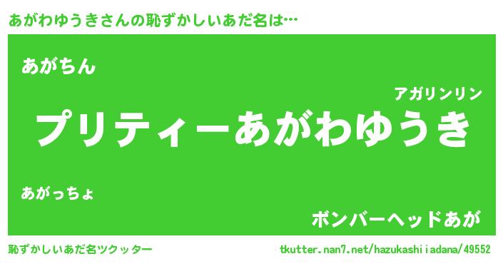 | ヘコむあだ名 | 『あがふぇ~』『あがわゆうき(遠い目)』 |
