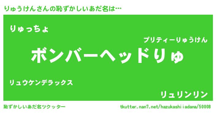 りゅうけんさんの恥ずかしいあだ名は… 『ボンバーヘッドりゅ』『りゅっちょ』『リュリンリン』 ツクッター #恥ずかしいあだ名ツクッター http://tkutter.nan7.net/hazukashiiadana/50008/