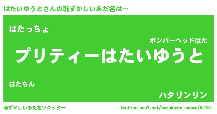はたいゆうとさんの恥ずかしいあだ名は… 『プリティーはたいゆうと』『はたっちょ』『ハタリンリン』 ツクッター #恥ずかしいあだ名ツクッター http://tkutter.nan7.net/hazukashiiadana/50195/